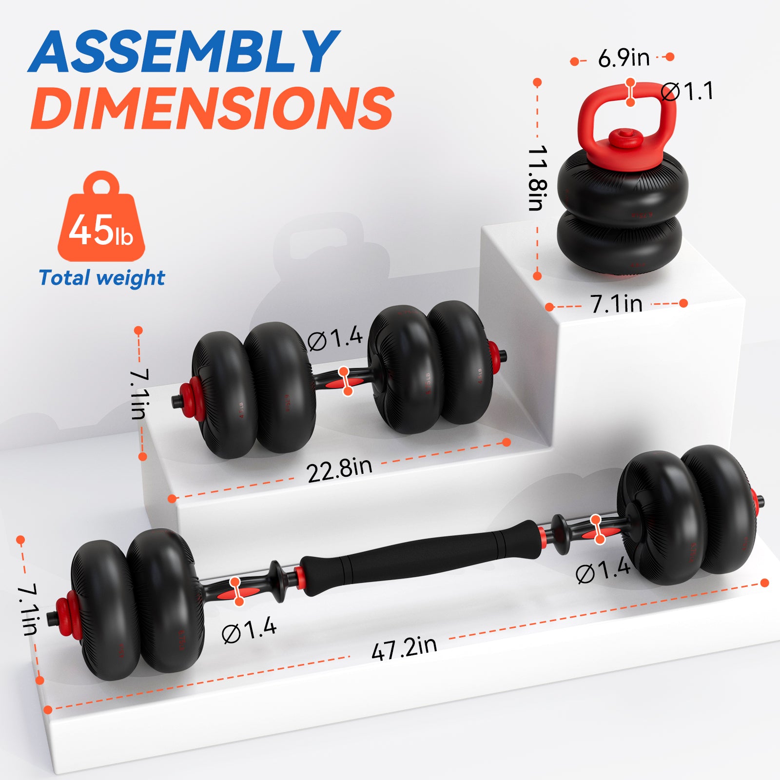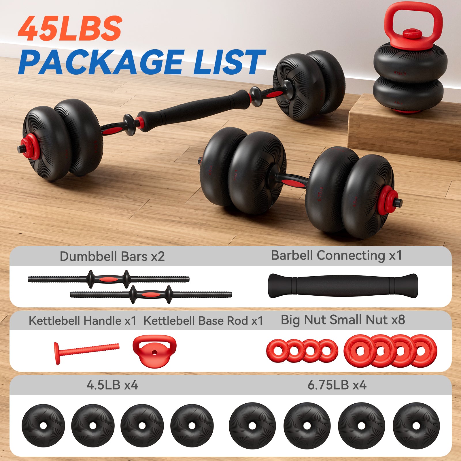 Adjustable Dumbbell Set, 45lbs/67lbs Free Weight Set, 4-in-1 Used as Barbell, Dumbbells, Kettlebell, Weight Plates, Soft Rubber Coated, Space Saving Fitness Exercise for Men/Women