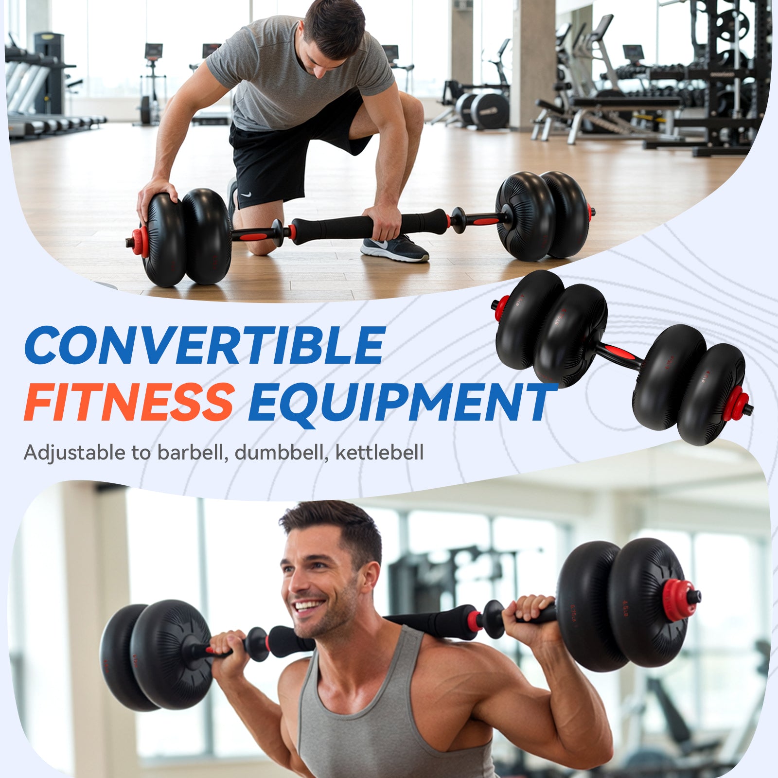 This TLGREEN all-in-one adjustable weight set maximizes home gym space, featuring secure dual-locking dumbbells, a soft PVC barbell for joint protection, and a non-slip grip. Perfect for all fitness levels, it easily adjusts from 9 to 27 lbs for versatile training.