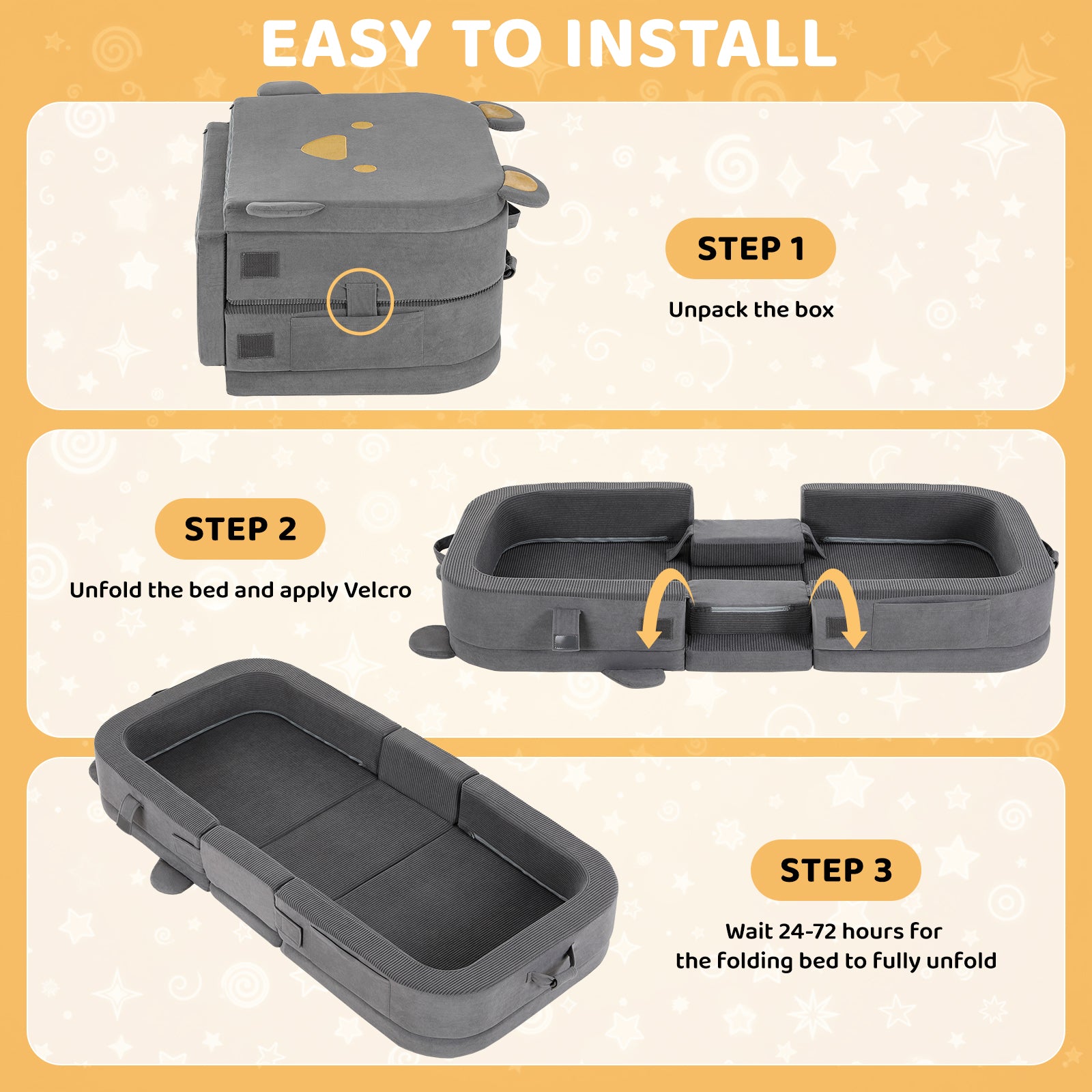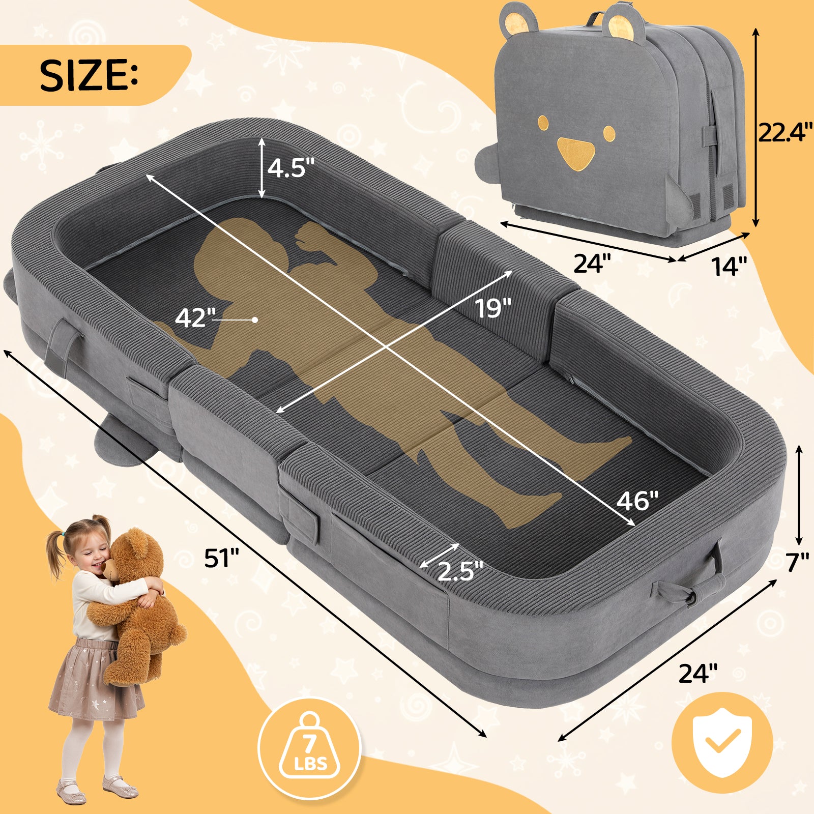 This lightweight (6.57 lbs) toddler bed is perfect for travel and home use. The 4-inch safety rail prevents rolling, and the machine-washable cover makes cleanups easy. It folds compactly for storage and doubles as a toy box. A familiar, cozy sleep space for your child at grandparents', hotels, or camping.
