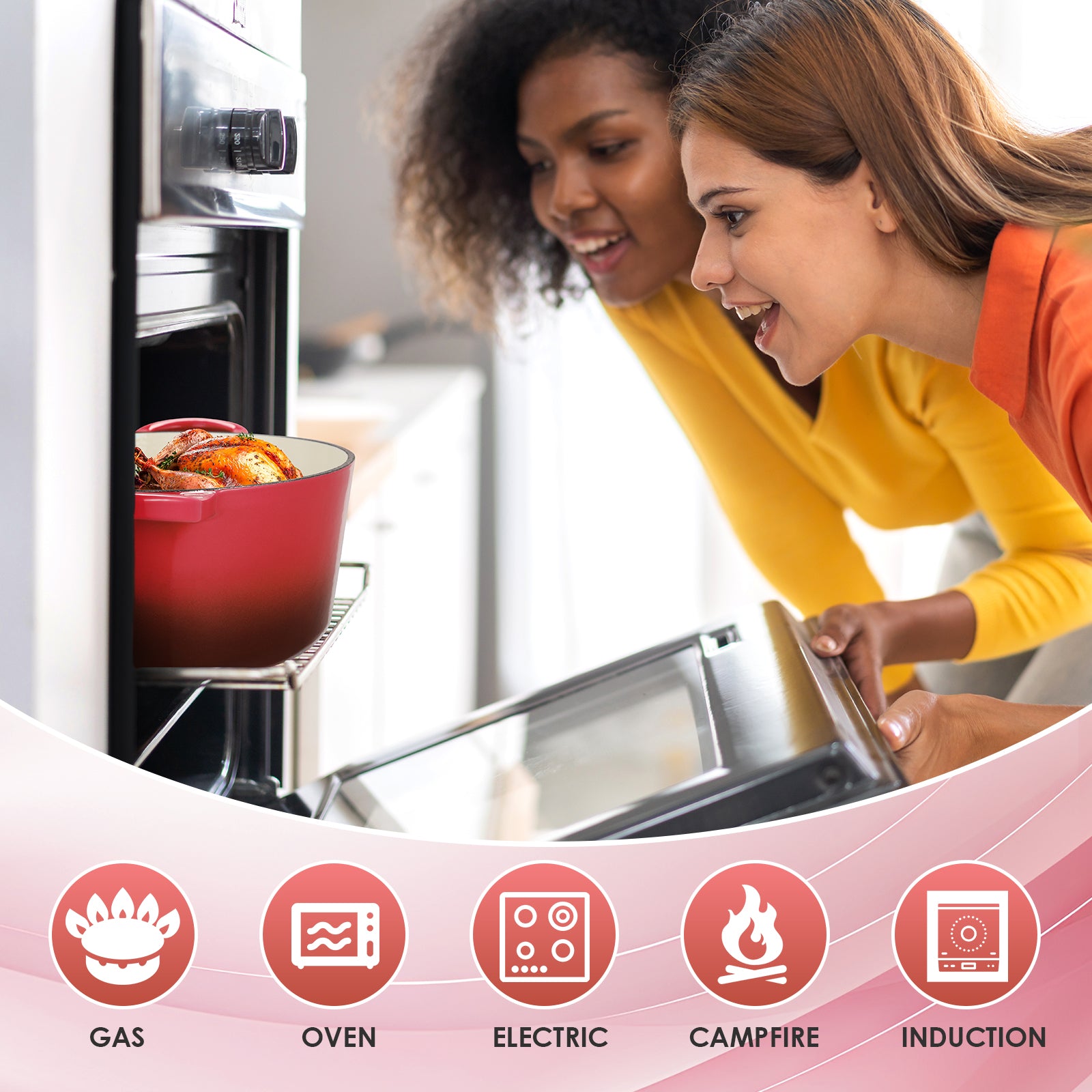 Safety Tips: This cookware is suitable for gas, electric, ceramic, grill, stovetop, and even induction. Plus, it's oven safe up to 500℉. Please note that always use an oven glove to remove the cookware from the hob as the handle will become hot during use.